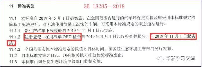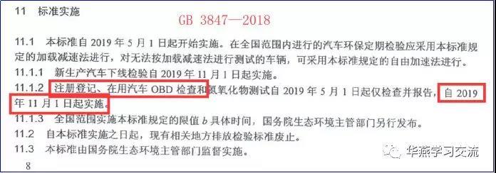 按照GB 18285—2018《汽油車污染物排放限值及測量方法(雙怠速法及簡易工況法)》和GB 3847—2018《柴油車污染物排放限值及測量方法(自由加速法及加載減速法)》的要求,汽油車和柴油車注冊登記、在用汽車OBD檢查自2019年11月1日起實施。